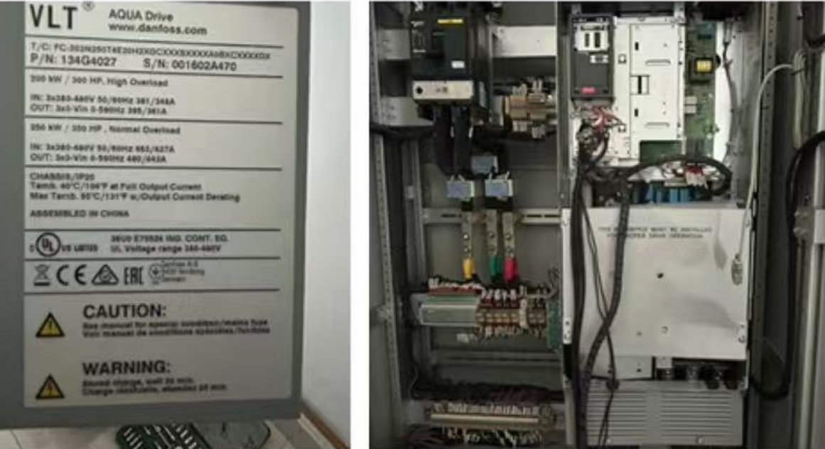 丹佛斯FC202是丹佛斯AQUA專用變頻器,是一款專用于水處理領域的變頻器,具備諸多適配水行業(yè)工況的特性與優(yōu)勢。由于用戶現(xiàn)場使用的是 200KW 潛水泵,且無法獲取電機參數(shù),所以上海津信維修人員首先對變頻器參數(shù)進行了調(diào)整,增大了電機額定電流。重新帶電機運行后,變頻器能夠上升至 45Hz,但隨后再次報出電流超限故障,并且電機發(fā)出異常聲響,呈現(xiàn)出明顯的缺相特征。?