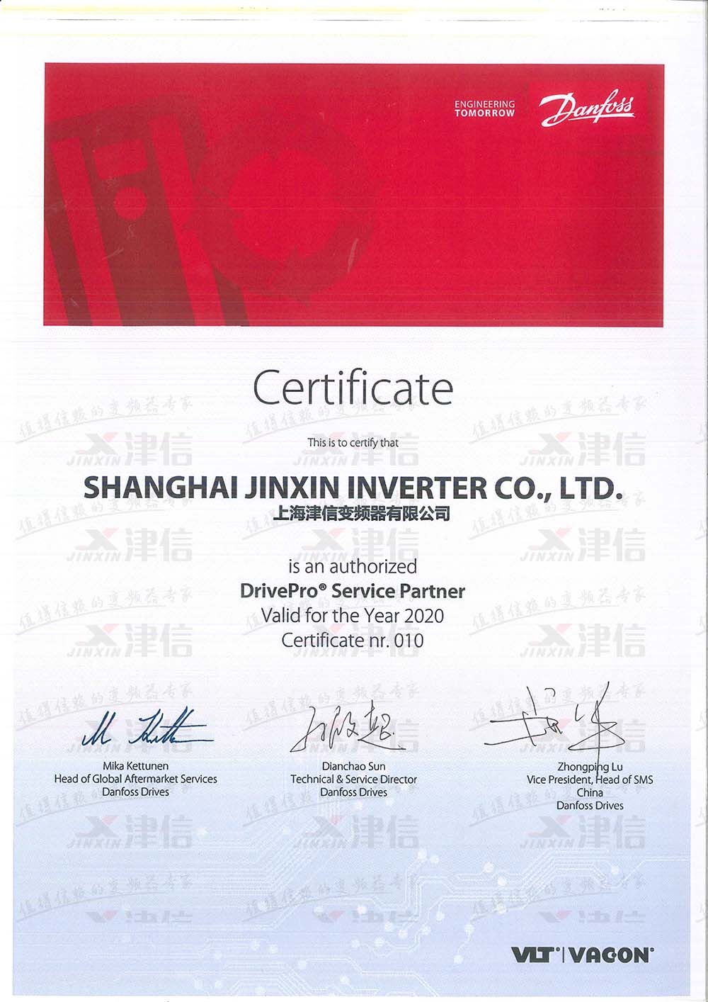丹佛斯和偉肯變頻器服務(wù)中心授權(quán)證書